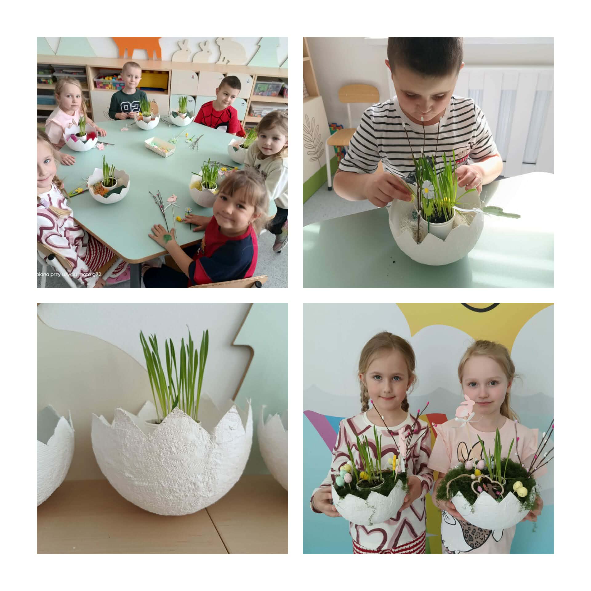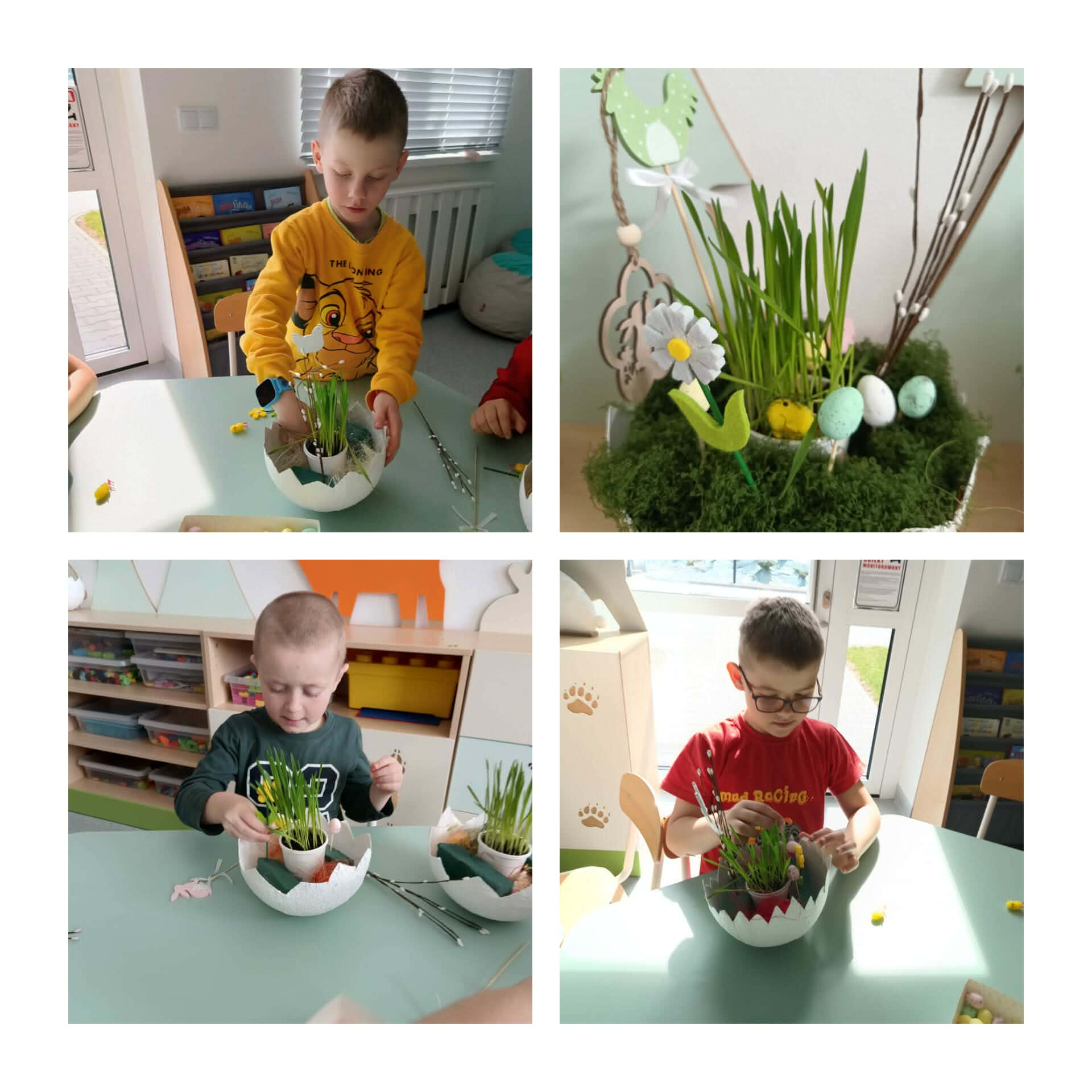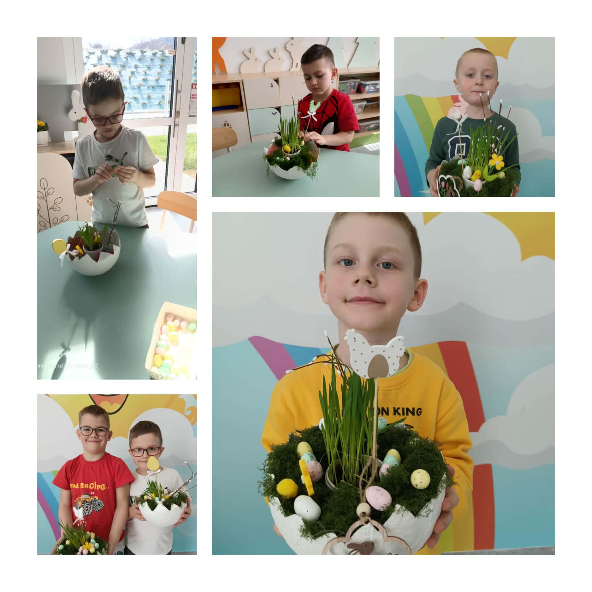 W naszej zerówce zrobiło się bardzo kolorowo i wiosennie! A to wszystko za sprawą wielkanocnych stroików, które dzieci przygotowały z ogromnym zaangażowaniem… bo przecież święta tuż, tuż! Powstały przepiękne, własnoręcznie wykonane stroiki pełne barw i ciekawych pomysłów. Nie zabrakło w nich owsa, który dzieci zasiały już wcześniej i który tak pięknie wyrósł, dodając pracom prawdziwie wiosennego charakteru!