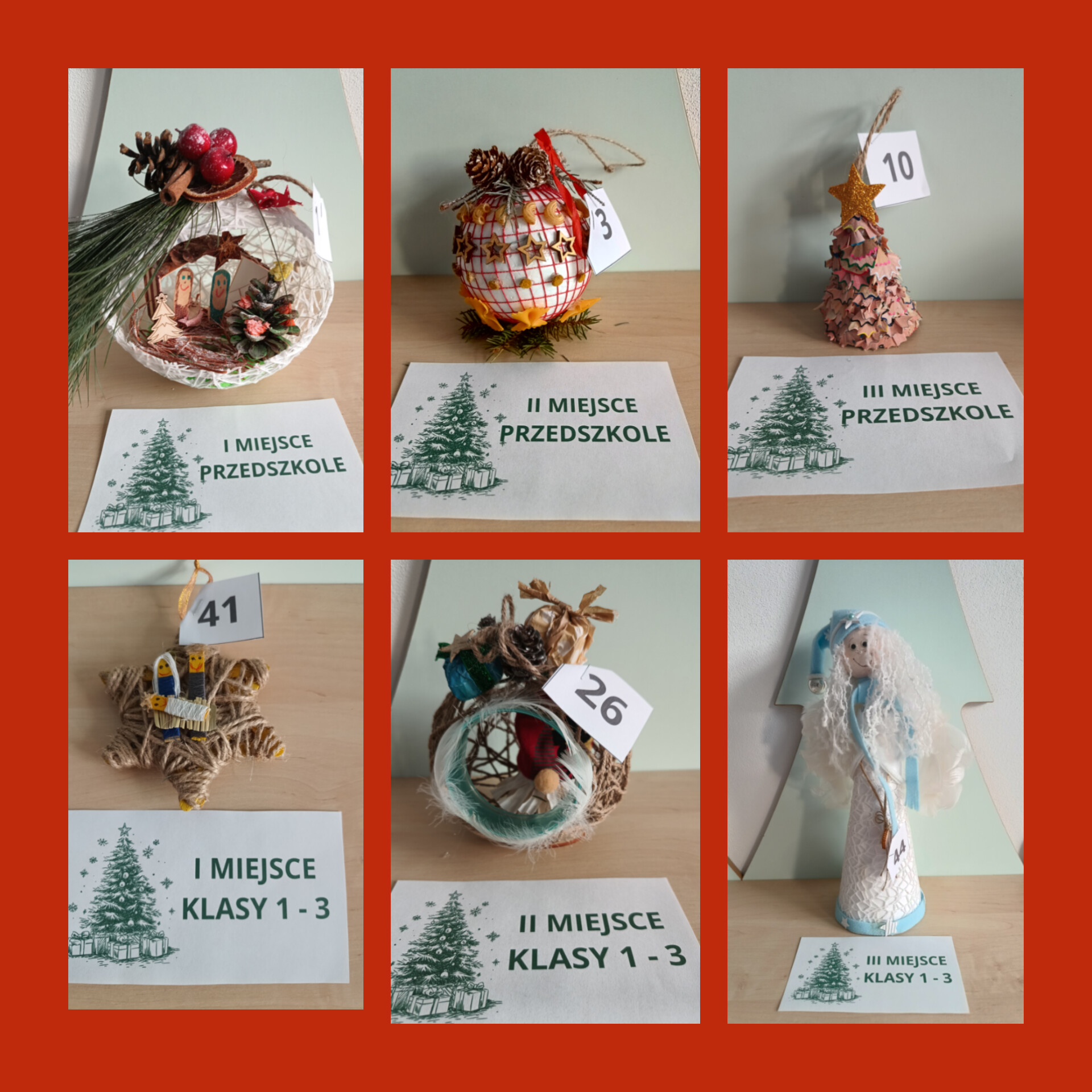 Dodatkowo, w trakcie apelu rozstrzygnięto szkolny konkurs dla uczniów klas I–III oraz dzieci z oddziałów przedszkolnych pt. „Eko – ozdoba na choinkę”. W każdej kategorii wiekowej przyznano trzy miejsca oraz wyróżnienia. Wszystkie dzieci, które wzięły udział w konkursie, zostały nagrodzone, a ich pomysłowe i ekologiczne prace wzbudziły duże zainteresowanie oraz uznanie. Uroczystość przebiegała w ciepłej, świątecznej atmosferze i była pięknym podsumowaniem przedświątecznego czasu.