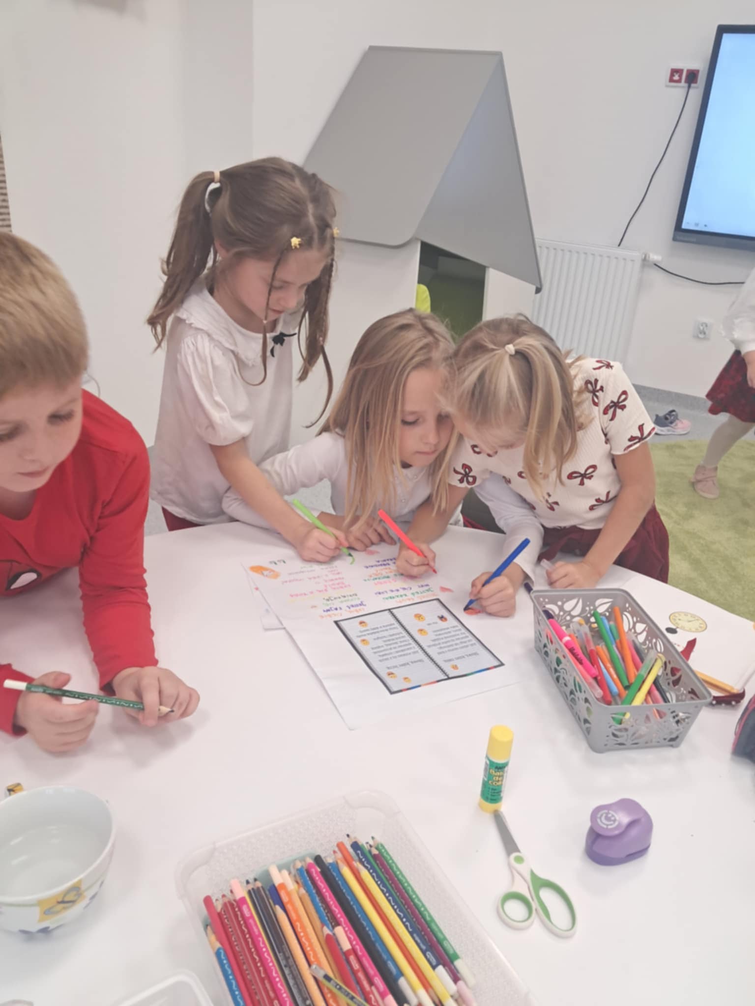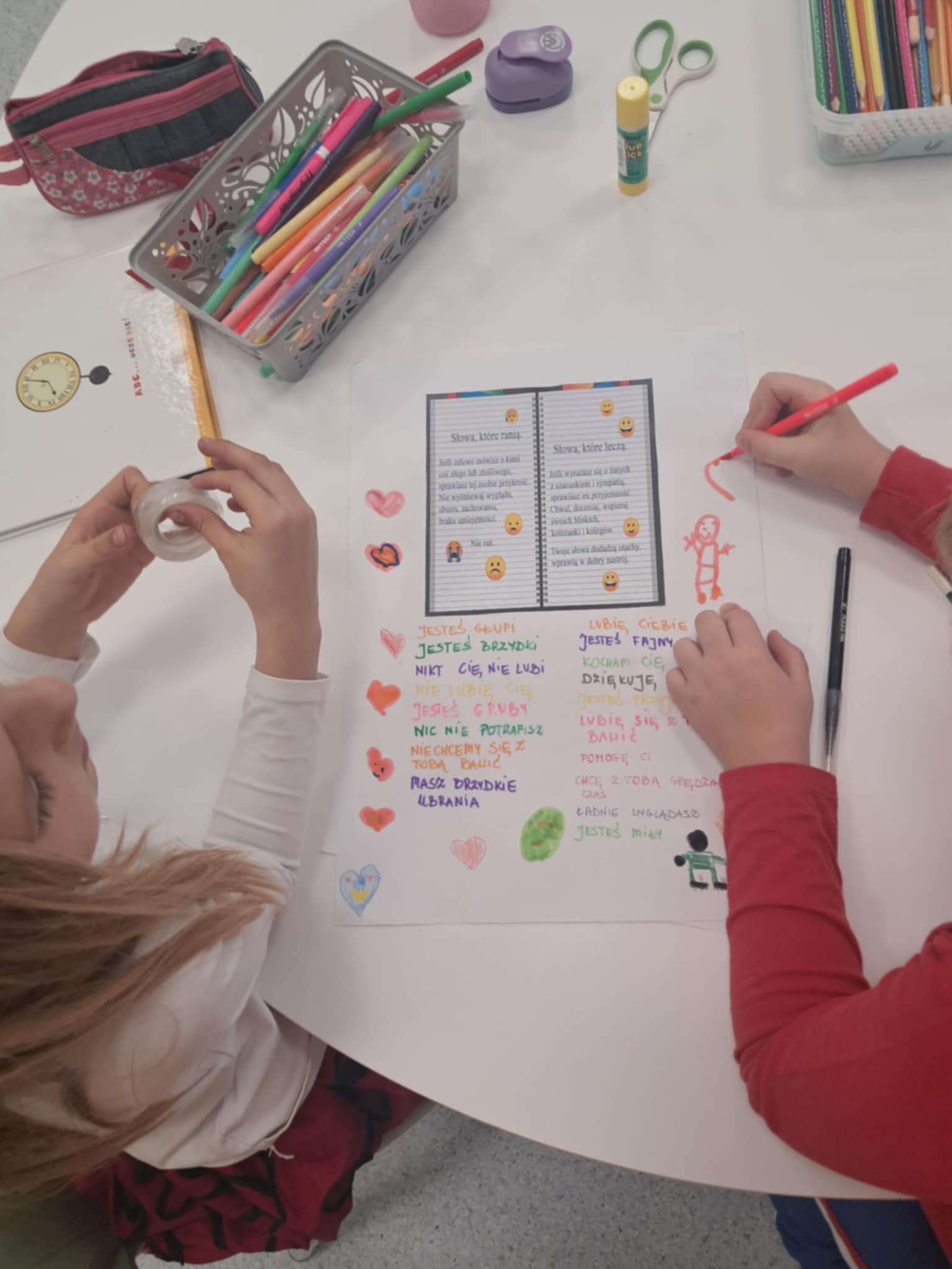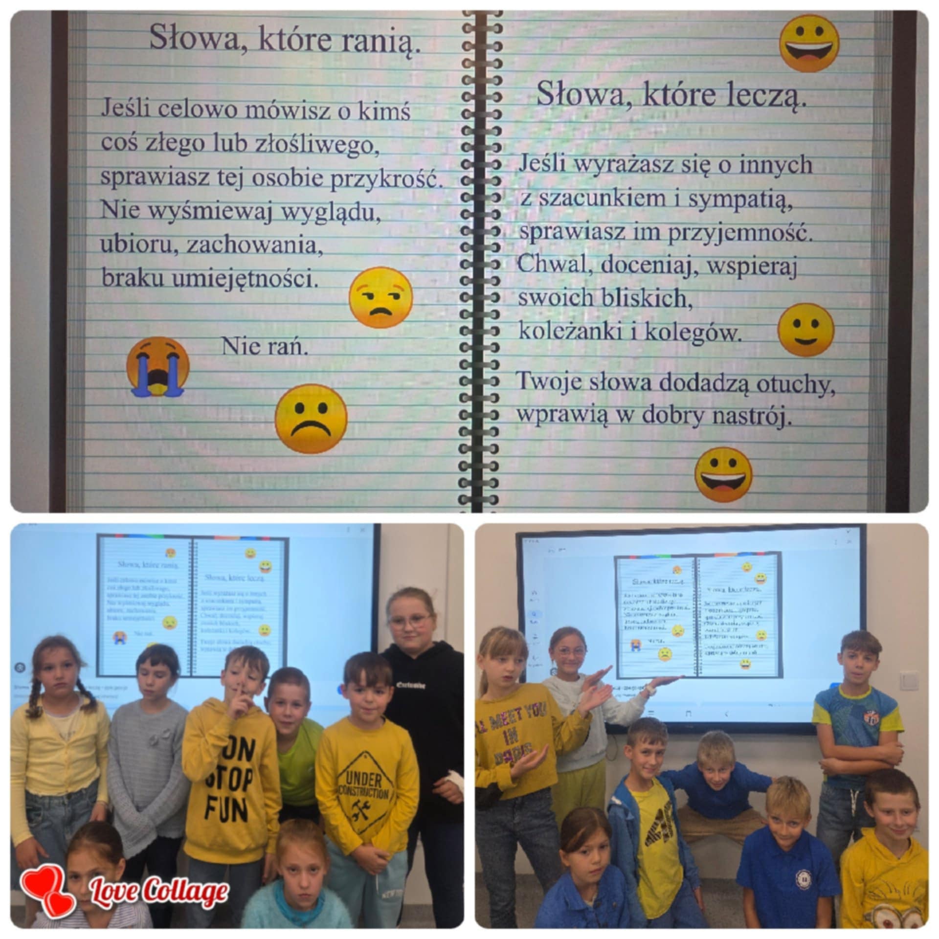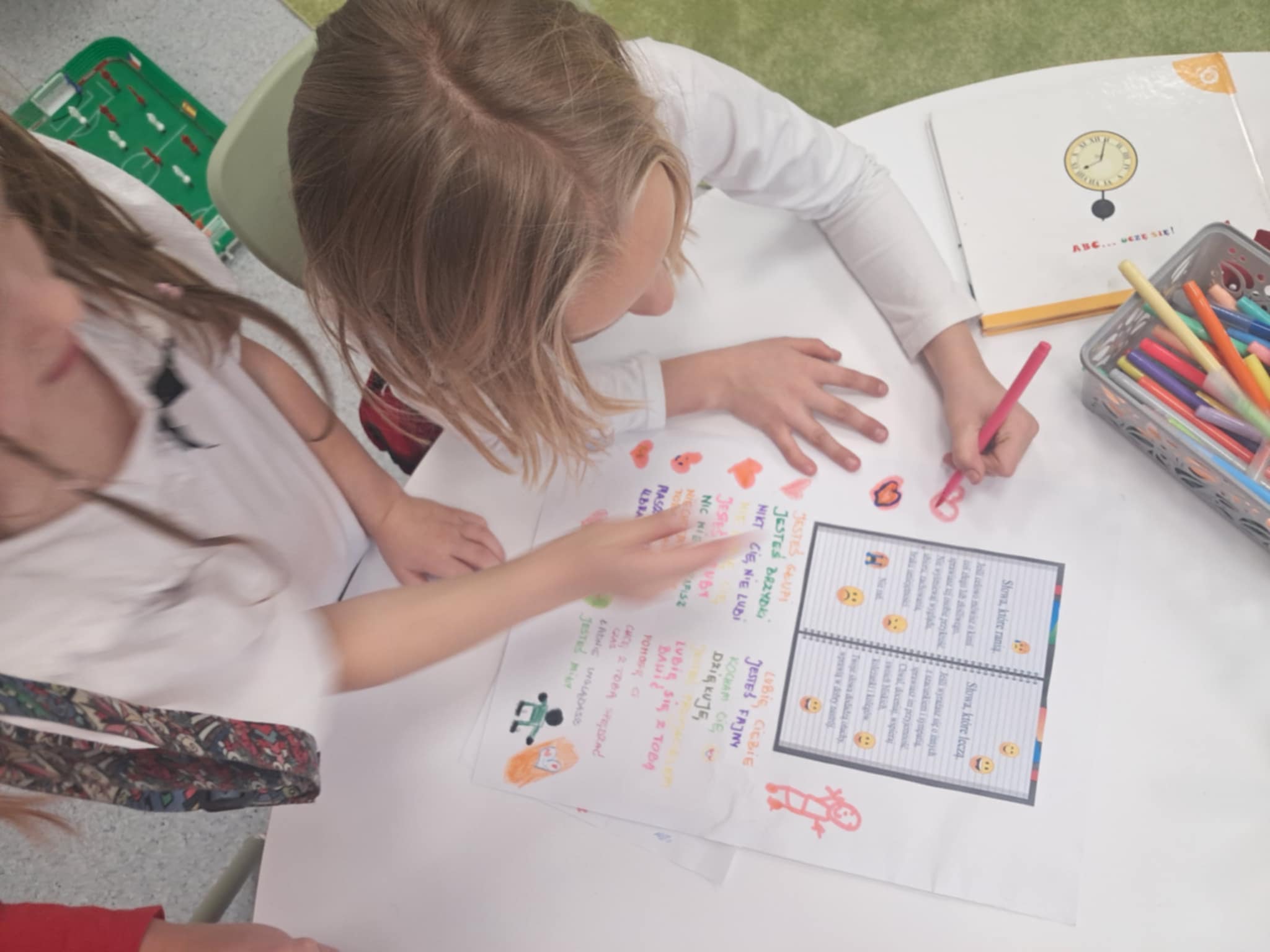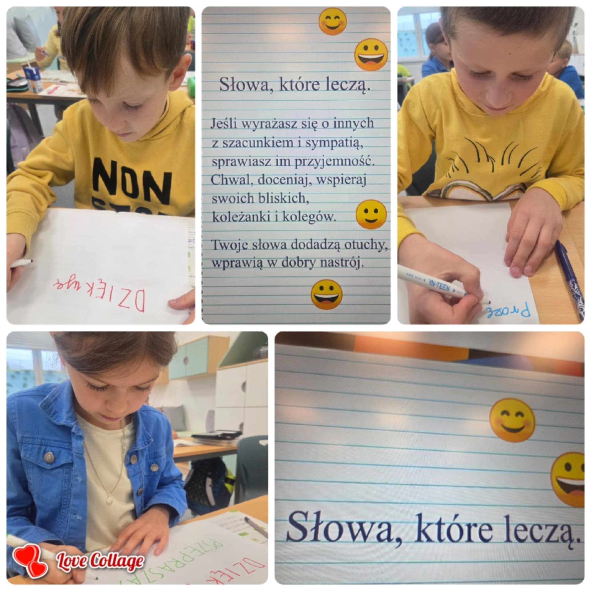 Dzisiaj w naszej Szkole odbyły się kolejne zajęcia poświęcone przeciwdziałaniu przemocy rówieśniczej. Uczniowie czytali krótkie teksty poruszające temat szacunku, empatii i przyjaźni, a następnie rozmawiali o tym, jak ważne jest wspieranie się nawzajem i reagowanie na trudne sytuacje. Dodatkowo dzieci wykonywały plakaty, na których pokazały, jak można mówić „STOP” przemocy i budować bezpieczną, przyjazną atmosferę w Szkole.